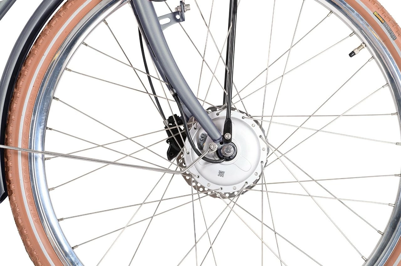 Äntligen har vi fått vår Chick igen! Den har varit slut en tid men är ständig efterfrågad. Det är något med den som tilltalar dem som vågar sticka ut litet grand, utan att för den sakens skull ge efter på kvalitet och funktion. Man får givetvis samma behagliga körställning som de övriga Chick. Händerna vilar på styret och ryggen är rak. En stark motor med fint vridmoment ger en ordentlig skjuts i backarna och håller medelhastigheten uppe. Skivbroms är ett krav på en sån här cykel, vilket man får från Nexus 7-växlade baknav. Handbromsen fram är hydraulisk och mycket effektiv. I den kraftiga korgen får man plats med inköpen, handväskan, eller en liten hund. Kromade fälgar ramas in av vita däck av med bra dimensioner. Fin batterikapacitet som räcker 5-8 mil. Finns i färgerna rosa och grå.